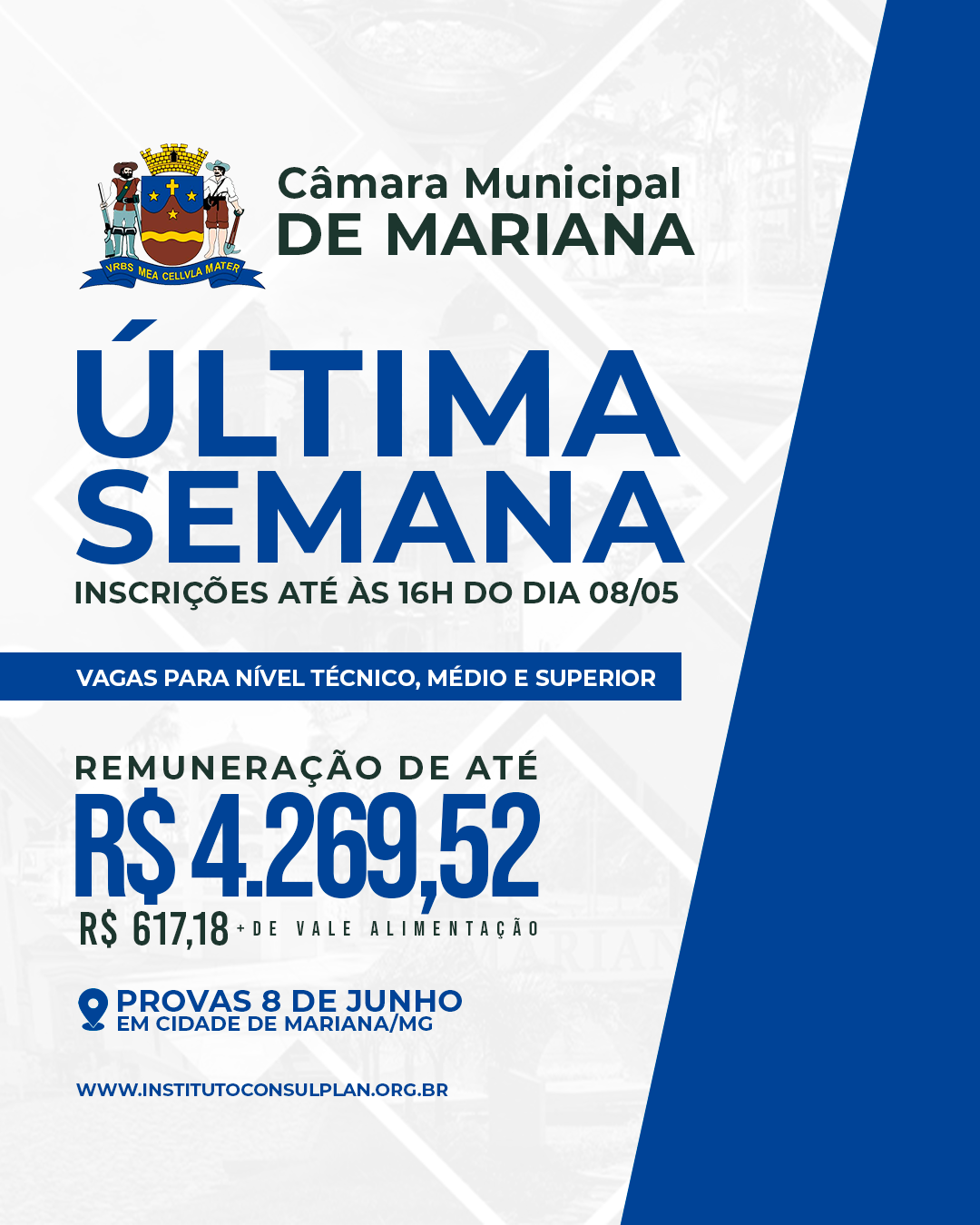 Entram na reta final as inscrições para o Concurso Público da Câmara Municipal de Mariana/MG, que oferece vagas para cargos de níveis Superior, Técnico e Médio. Os interessados têm até as 16h da próxima quarta-feira, 8 de maio de 2025, para se inscrever exclusivamente pelo site oficial do Instituto Consulplan (www.institutoconsulplan.org.br).