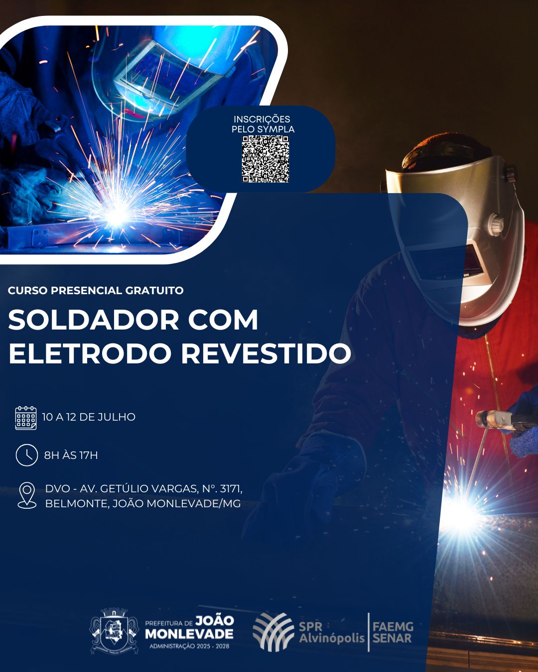 A Prefeitura de João Monlevade, em parceria com o Sistema Faemg/Senar e o Sindicato dos Produtores Rurais de Alvinópolis, está com inscrições abertas para o curso gratuito e presencial de Soldador com Eletrodo Revestido. A capacitação será realizada entre os dias 10 e 12 de julho, das 8h às 17h, na sede das secretarias de Obras e Serviços Urbanos (av. Getúlio Vargas, nº 3171, bairro Belmonte).