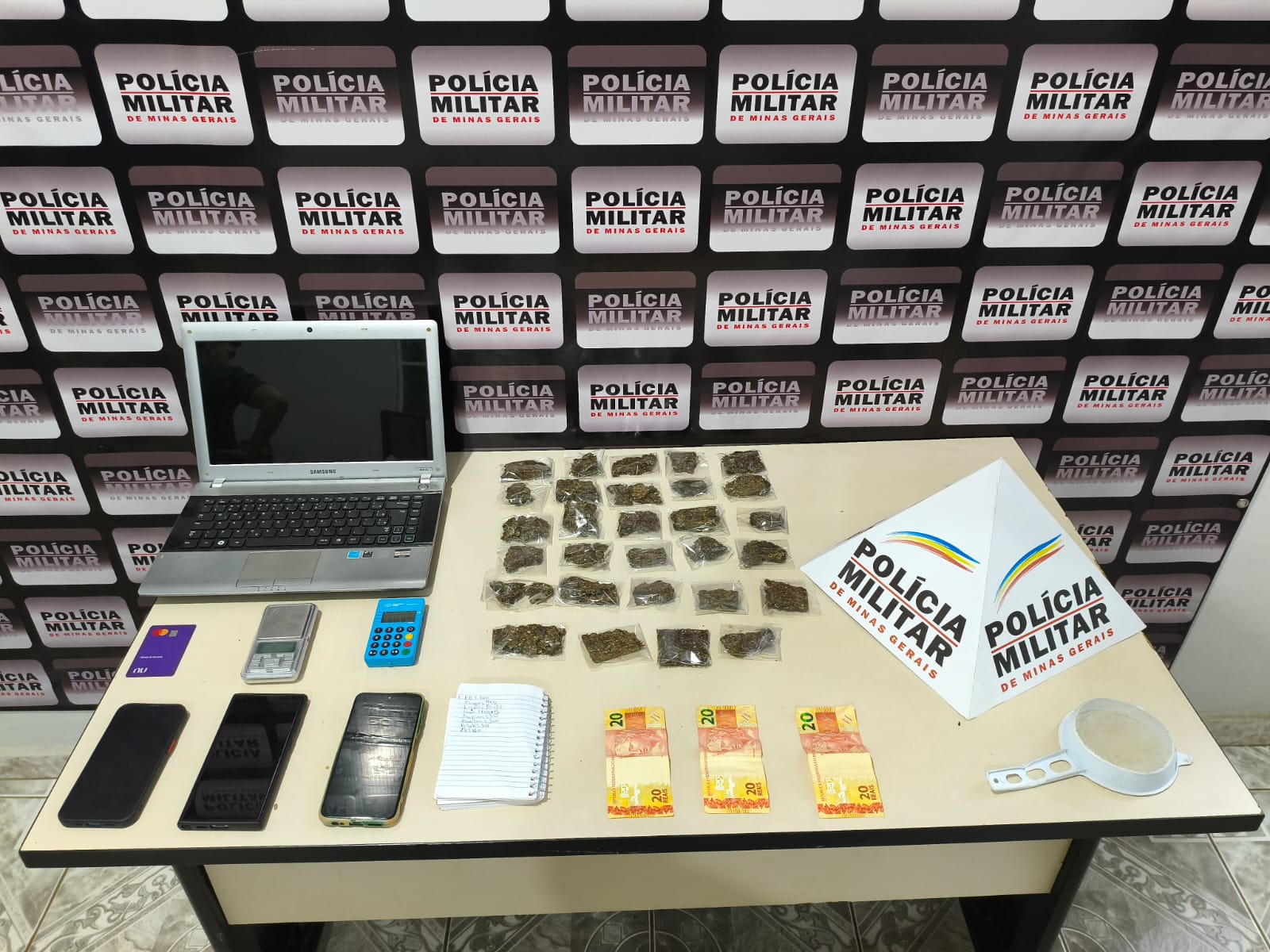 Na busca pessoal, os militares encontraram duas buchas de maconha embaladas para venda, R$ 60 em dinheiro, uma máquina de cartão do Mercado Pago e um celular iPhone 13. Em diligências posteriores, os policiais localizaram outros materiais ilícitos e conseguiram apreender a motocicleta Honda Tornado preta utilizada na fuga.