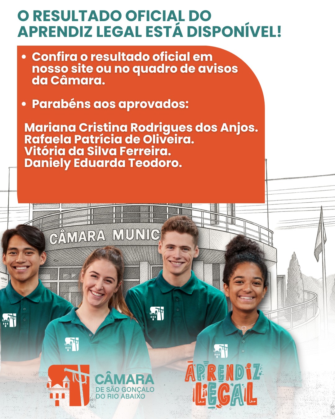 A Câmara Municipal de São Gonçalo do Rio Abaixo divulgou nesta quarta-feira, 19 de novembro, o resultado oficial do Aprendiz Legal 2025. Não houve alteração em relação ao resultado preliminar, divulgado no último dia 11, não sendo registrados recursos.