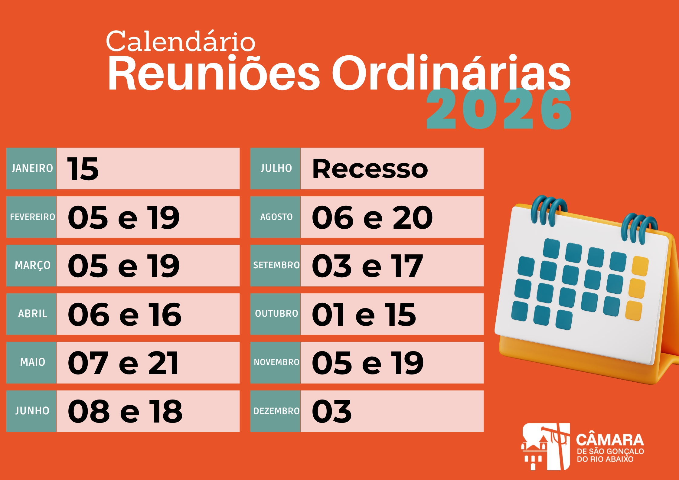 A Câmara Municipal de São Gonçalo do Rio Abaixo divulgou oficialmente o calendário de reuniões ordinárias para o ano legislativo de 2026. O calendário estabelece previamente as datas em que os vereadores se reunirão em plenário para discutir, analisar e deliberar sobre matérias de interesse do município, como projetos de lei, indicações e demais proposições legislativas.