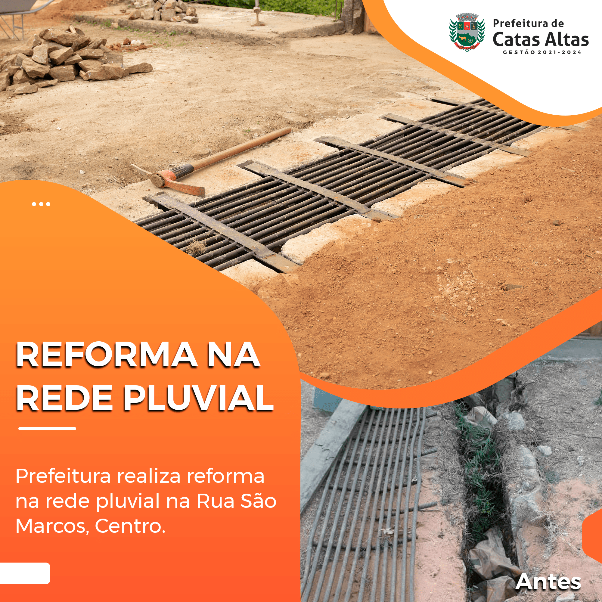As melhorias não param. Com a chegada do período chuvoso, a Prefeitura, em por meio da Secretaria de Obras, realizou uma manutenção e reforma na rede pluvial na Rua São Marcos, atendendo a solicitação dos moradores.