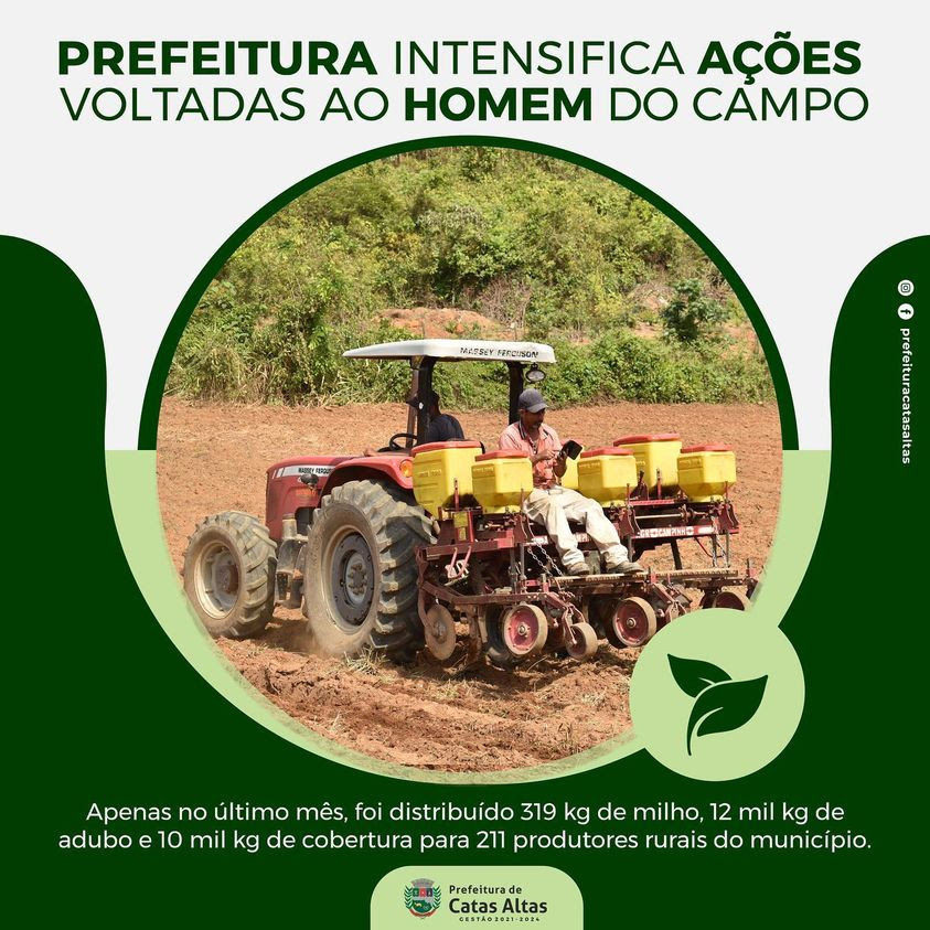 No mês de outubro a Secretaria de Agricultura e Meio Ambiente intensificou a distribuição de insumos e a preparação das terras para plantio. Apenas no último mês, foi distribuído 319 kg de milho, 12 mil kg de adubo e 10 mil kg de cobertura para 211 produtores rurais do município.