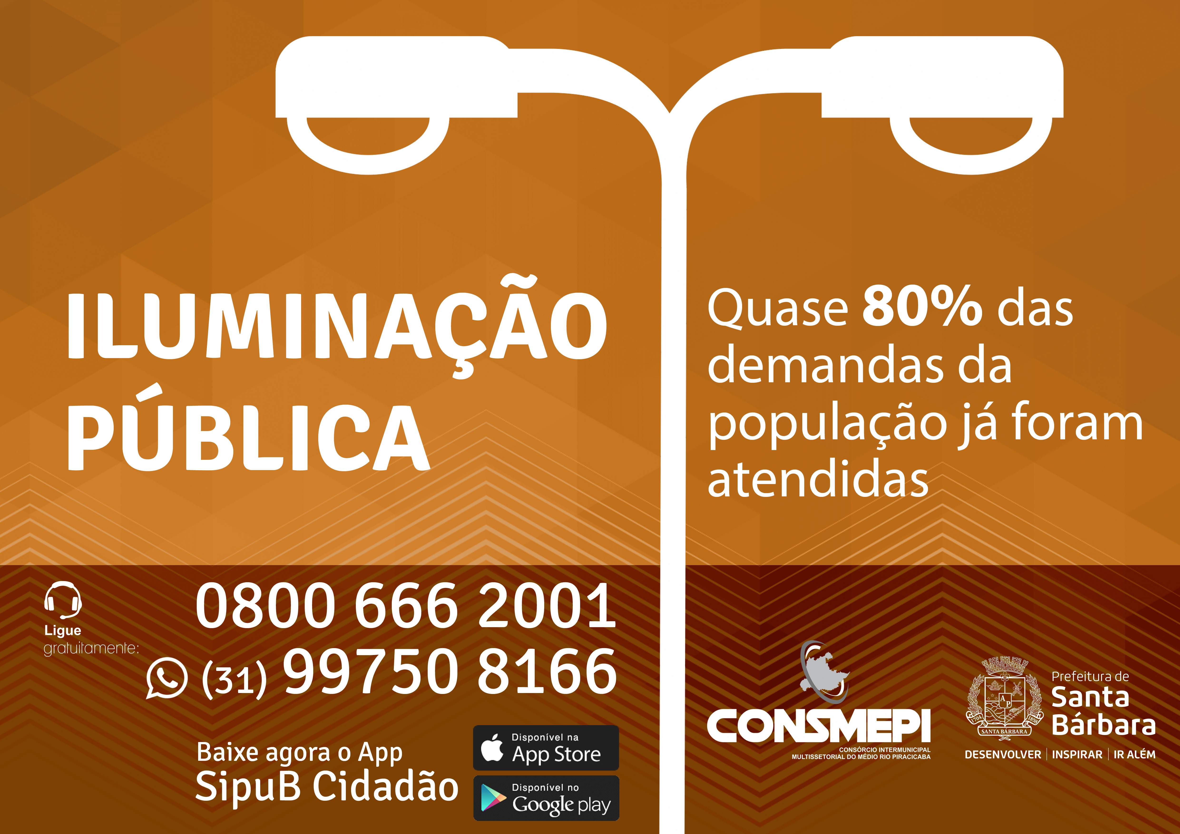 Solicitação. Para solicitar a manutenção ou reparos na iluminação pública, basta entrar em contato com o Consmepi pelo telefone 0800 666 2001 ou pelo WhatsApp (31) 99750-8166. Você também pode fazer sua solicitação pelo aplicativo Sipub Cidadão, disponível para Android e IOS.