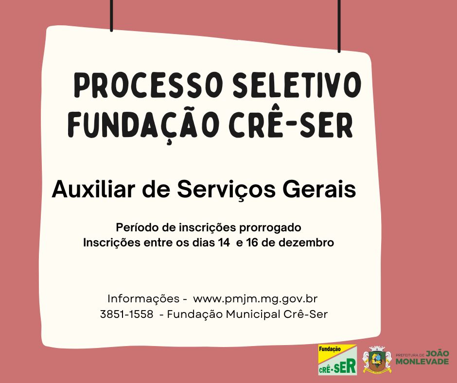 A Prefeitura de João Monlevade, por meio da Fundação Municipal Crê-Ser, prorrogou as inscrições do processo seletivo que vai contratar auxiliar de serviços gerais.