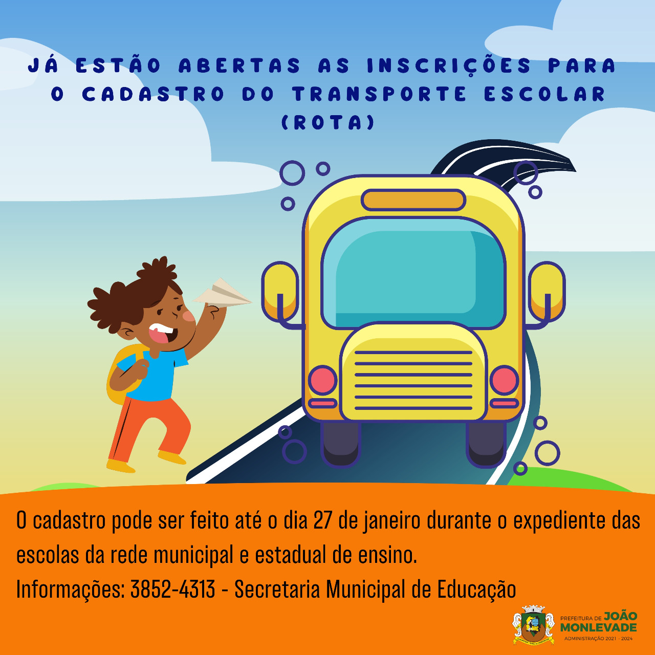 A Prefeitura de João Monlevade, por meio da Secretaria Municipal de Educação, informa que o cadastro para o transporte escolar (Rota) está sendo realizado nas escolas públicas durante a matrícula dos alunos e segue até o dia 27 de janeiro. Vale lembrar que os estudantes que já utilizam o transporte escolar não precisam se cadastrar a não ser em caso de transferência.