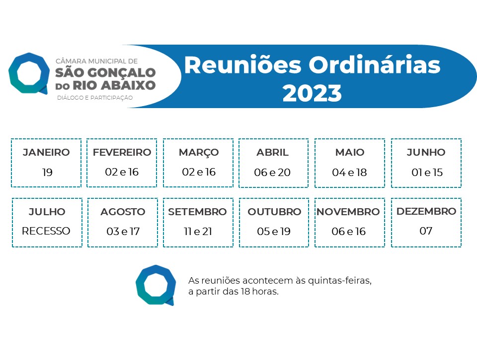 Já estão agendadas as datas das Reuniões Ordinárias da Câmara Municipal de São Gonçalo do Rio Abaixo, em 2023. O calendário foi publicado na Portaria nº 01/2023, e abre as atividades na quinta-feira, 19 de janeiro. O ano de trabalho tem o encerramento previsto para 07 de dezembro.