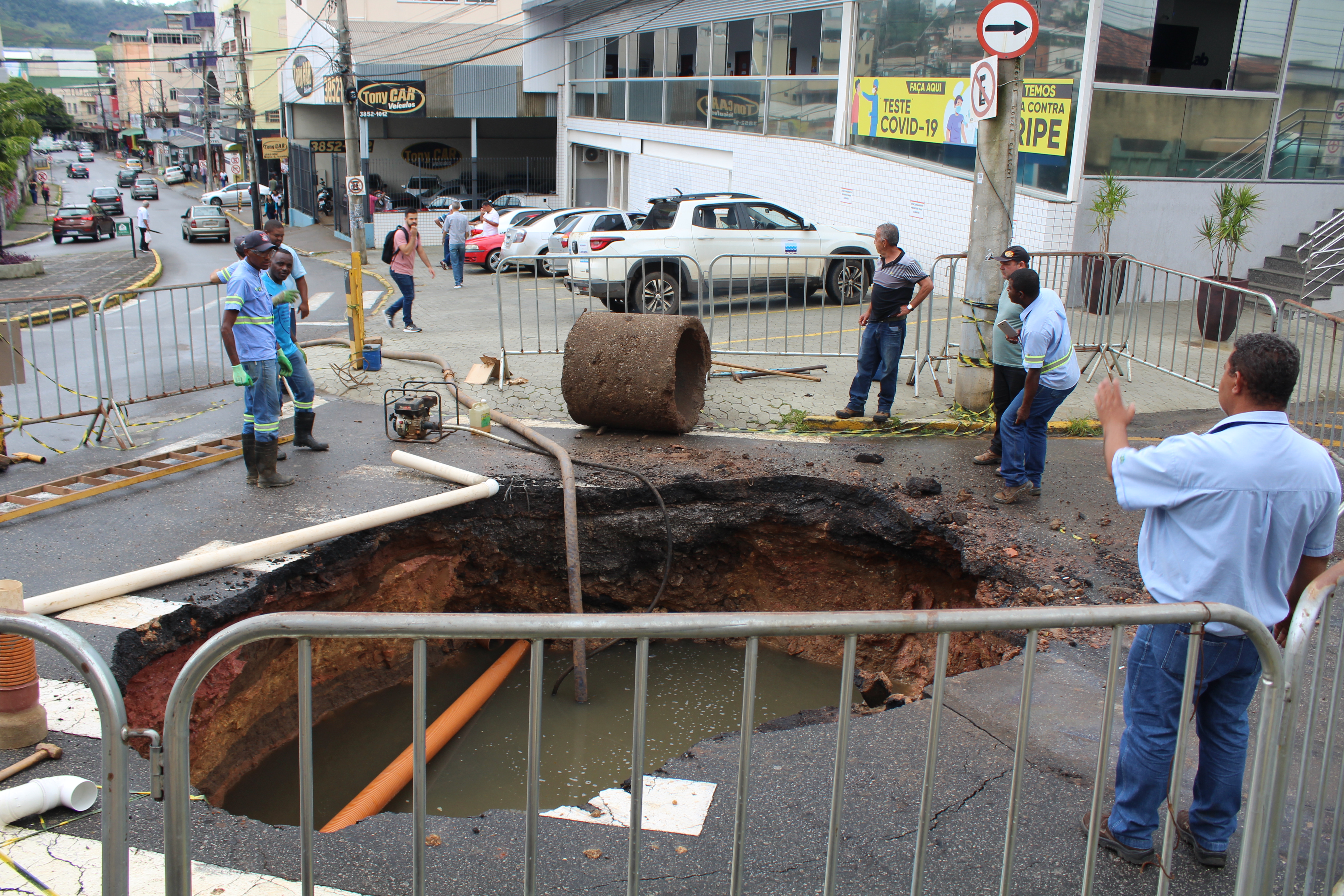 O asfalto cedeu por um abatimento de rede pluvial e de esgoto devido às chuvas intermitentes que caem na região desde a semana passada. Imediatamente, a Defesa Civil Municipal, a Secretaria Municipal de Obras e o Setor de Trânsito e Transportes (Settran) se dirigiram para o local.