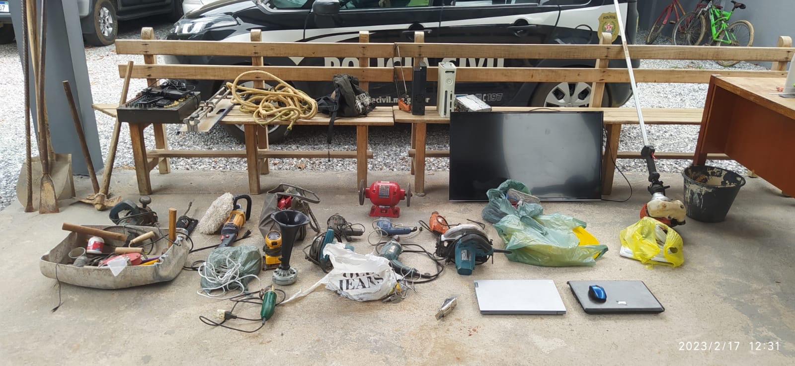 Em uma construção inacabada nos fundos da residência do receptador foram localizados dezenas de equipamentos e maquinários com características de objetos furtados nos últimos meses nesta cidade. Os materiais foram apreendidos após contato com diversas vítimas e estas reconhecerem os objetos furtados em datas pretéritas.