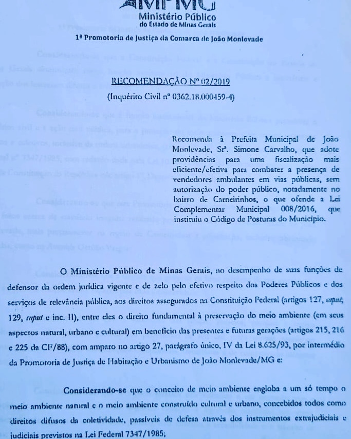 Por pura politicagem, alguns pré-candidatos e pessoas desinformadas, com intuito de aparecer e ficam insinuando que a ação promovida pela prefeitura, seria perseguição contra os ambulantes. Segue abaixo cópia do documento enviado pelo Ministério Público para a prefeitura de João Monlevade.