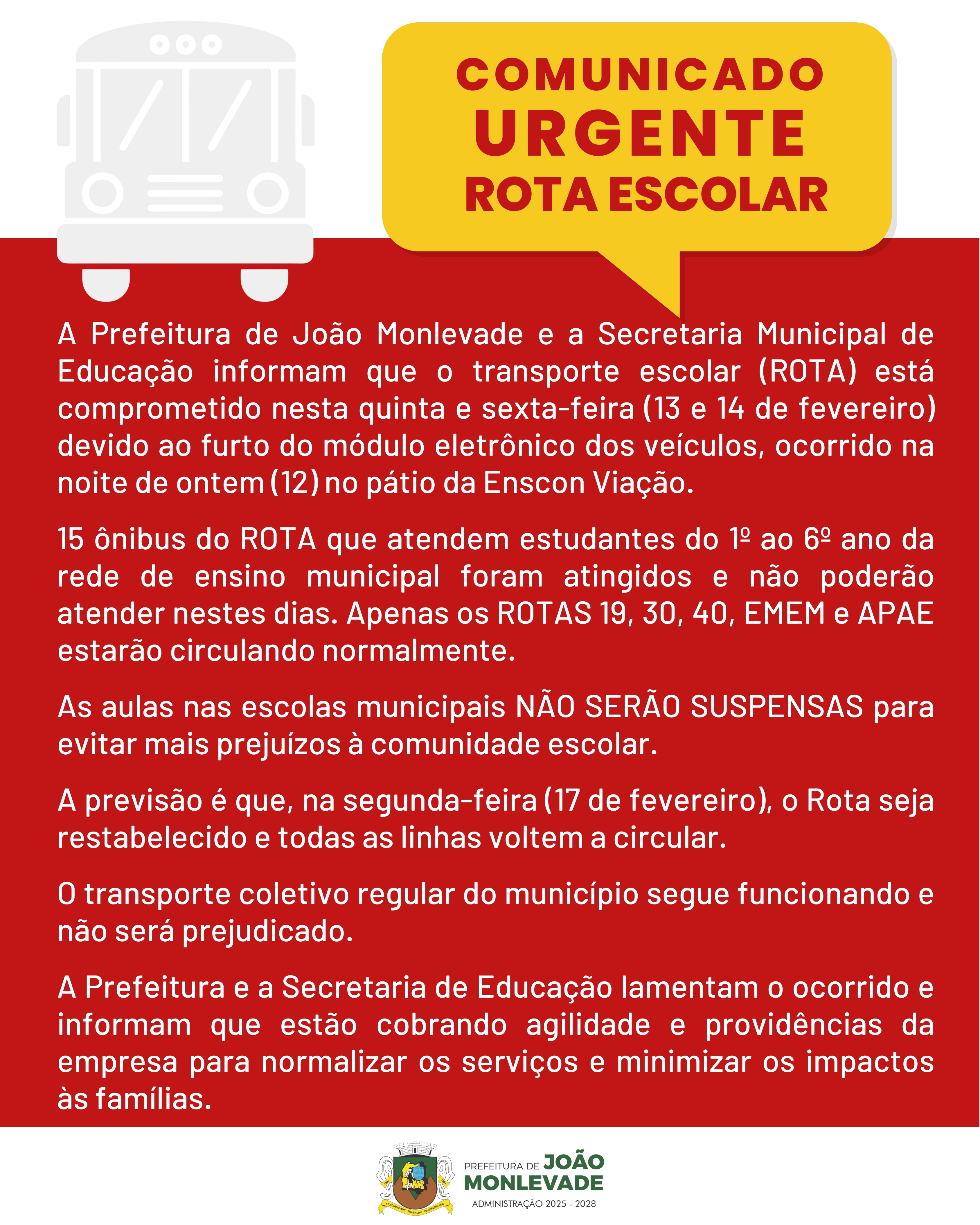 A Prefeitura de João Monlevade e a Secretaria Municipal de Educação informam que o transporte escolar (ROTA) está comprometido nesta quinta e sexta-feira (13 e 14 de fevereiro) devido ao furto do módulo eletrônico dos veículos, ocorrido na noite de ontem (12) no pátio da Enscon Viação.