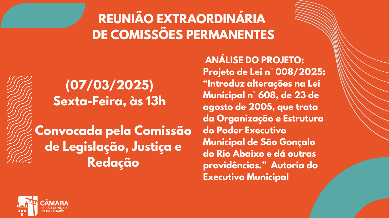 A Câmara de São Gonçalo realiza nesta sexta-feira, 07 de março, às 13h, nova Reunião Extraordinária de Comissões Permanentes, acerca do Projeto de Lei n° 008/2025, que “Introduz alterações na Lei Municipal n° 608, de 23 de agosto de 2005, que trata da Organização e Estrutura do Poder Executivo Municipal de São Gonçalo do Rio Abaixo e dá outras providências.” – Autoria do Executivo Municipal.