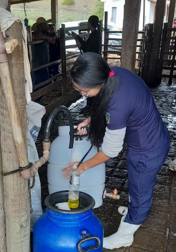 A primeira aula prática ocorreu na última semana, quando estudantes realizaram testes de mastite antes da primeira ordenha do dia, utilizando o CMT e a caneca de fundo preto. Além da aplicação dos exames, os alunos orientaram os produtores rurais sobre o uso correto dos métodos, promovendo capacitação direta no campo.
