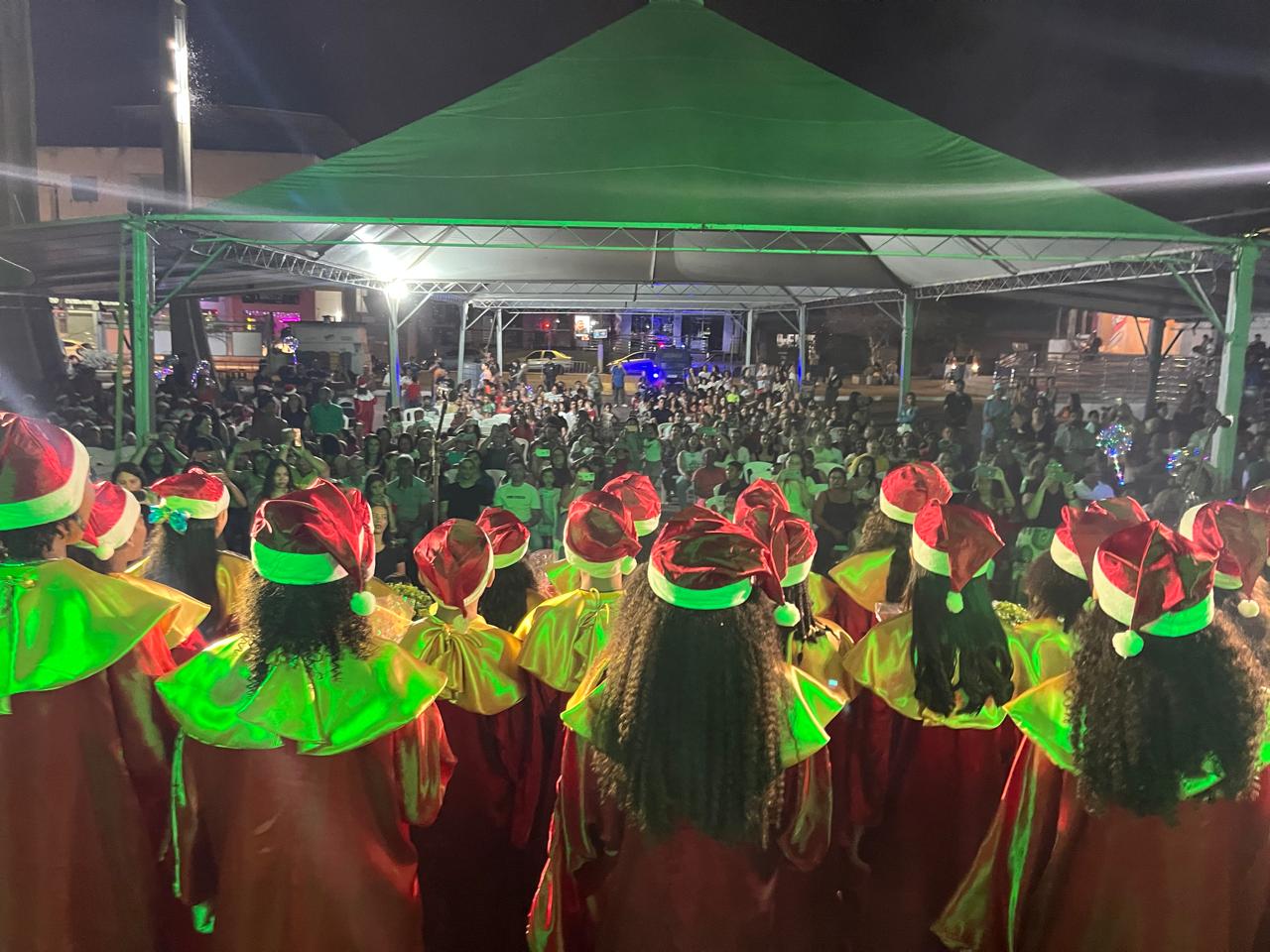 Encerrando as apresentações, os alunos da Escola Municipal de Tempo Integral Maria de Lourdes Duarte Moreira dos Santos, regidos pelo professor Marcelo Hautequeste, cantaram “Terra Seca”, “Feliz Natal (Carrossel)” e “Santo Pra Sempre”, finalizando a noite com mensagens de fé, paz e gratidão.