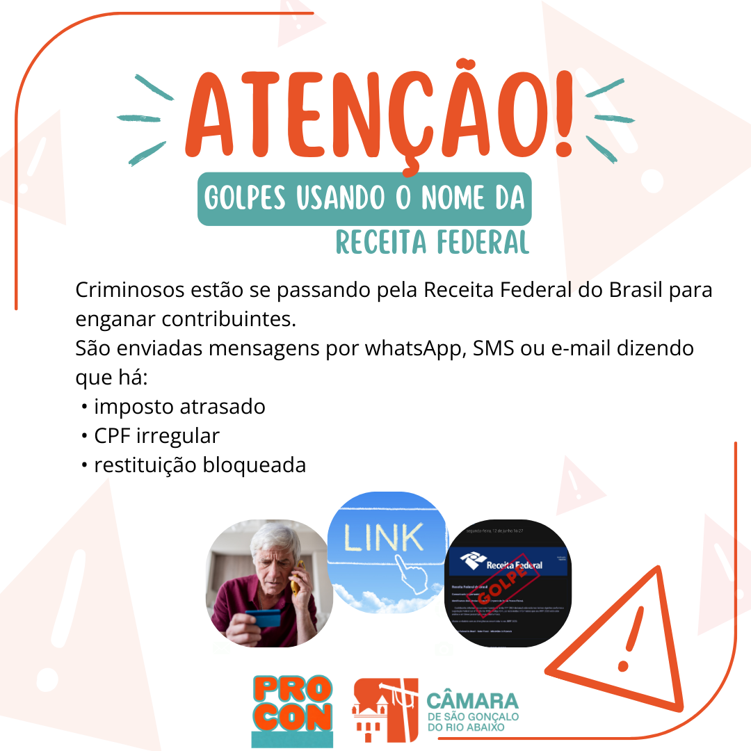 A Câmara Municipal de São Gonçalo do Rio Abaixo, por meio do Procon da Casa Legislativa, emitiu um alerta à população sobre a ocorrência de golpes que utilizam indevidamente o nome da Receita Federal para enganar contribuintes.