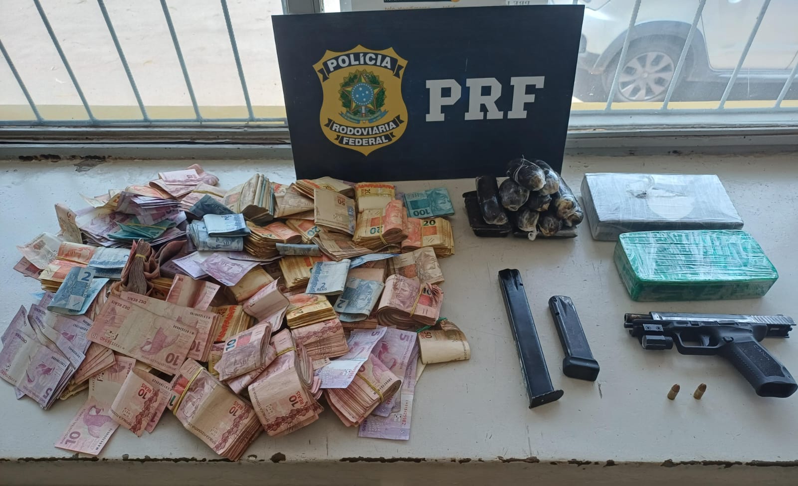 A Polícia Rodoviária Federal (PRF) apreendeu drogas, uma arma de fogo de uso restrito e a quantia de R$ 69.462,00 em dinheiro durante fiscalização realizada no km 121 da BR-262, no município de Rio Casca (MG), após abordar um veículo Citroën/Aircross conduzido por um homem de 23 anos.