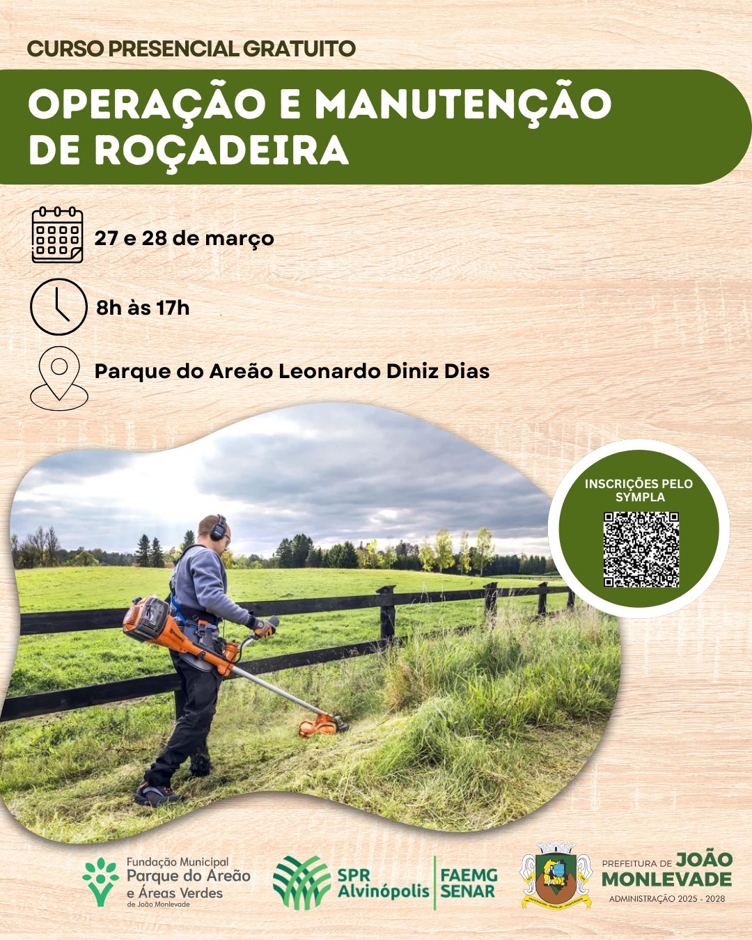 A Prefeitura de João Monlevade, por meio da Fundação Municipal Parque do Areão e Áreas Verdes, em parceria com o SPR Alvinópolis e o Sistema FAEMG/SENAR, realiza nos dias 27 e 28 de março o Curso Presencial Gratuito de Operação e Manutenção de Roçadeira. A capacitação será das 8h às 17h, no Parque do Areão Leonardo Diniz Dias.