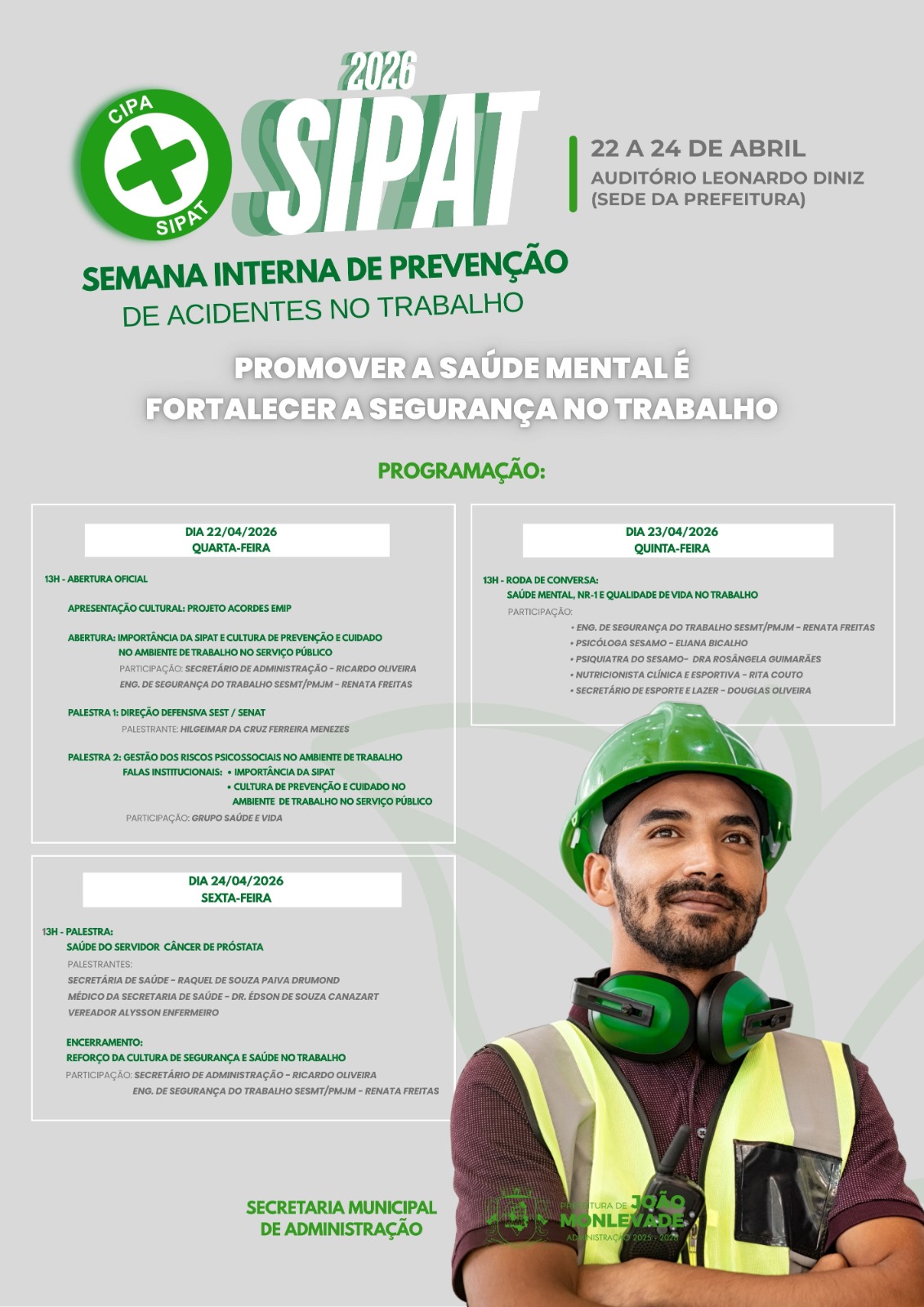 A Prefeitura de João Monlevade, por meio da Secretaria Municipal de Administração, realiza entre os dias 22 e 24 de abril a Semana Interna de Prevenção de Acidentes no Trabalho (Sipat 2026). O evento será realizado no Auditório Leonardo Diniz, na sede da Prefeitura, com uma programação voltada à promoção da saúde mental e ao fortalecimento da cultura de segurança no ambiente de trabalho.