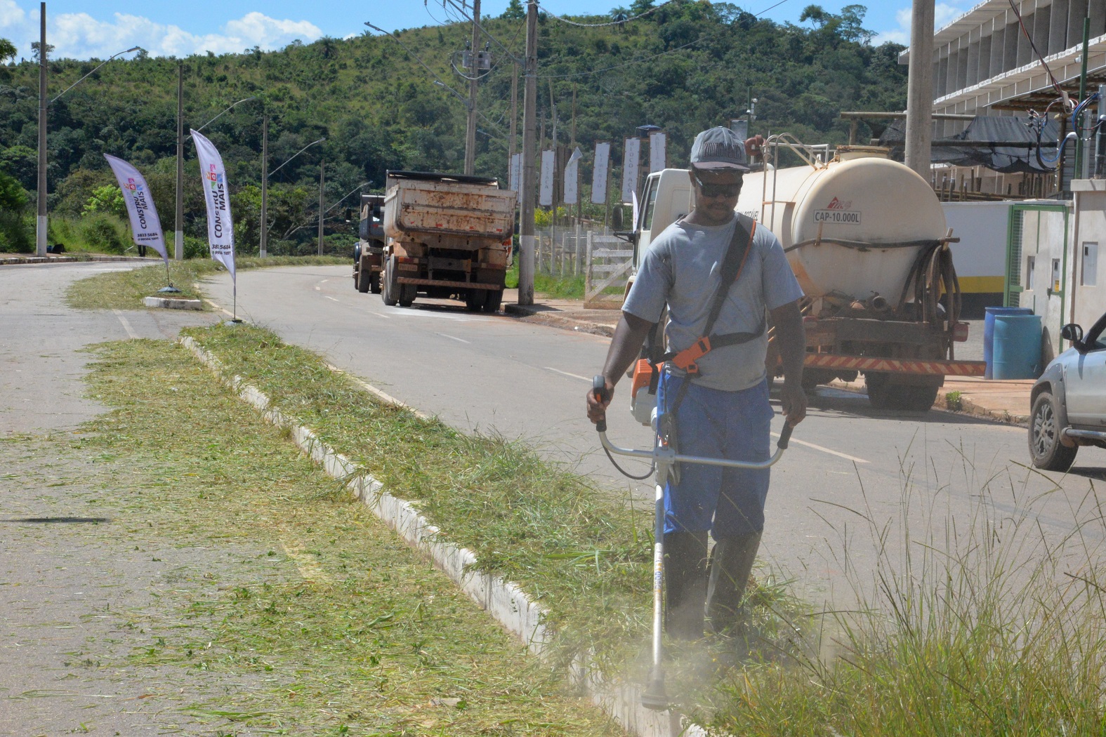aparando as gramas e o mato nos canteiros centrais e margens das avenidas.