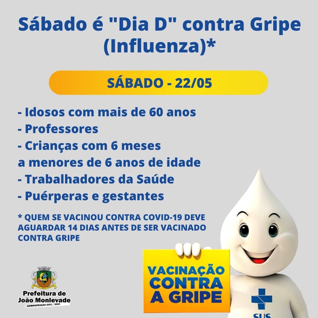 Neste sábado, dia 22 de maio, a Prefeitura de João Monlevade, por meio da Vigilância em Saúde (Visa), fará a vacinação contra a gripe (Influenza). No “Dia D” serão vacinados idosos com mais de 60 anos, professores, crianças com idade de 6 meses a menores de 6 anos; trabalhadores da saúde; gestantes e puérperas.