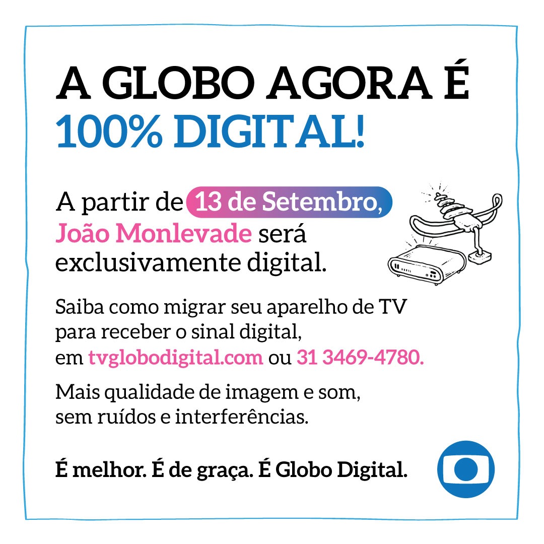 A partir do dia 13/09, o sinal de televisão da TV Globo em João Monlevade será exclusivamente digital. A transmissão digital é gratuita e tem imagem e som em alta qualidade, sem chuviscos ou distorções. Para recebê-la, é necessário observar as especificações de cada televisão e obter uma antena UHF. Se a TV for de um modelo antigo (fabricado antes de 2010), é preciso comprar um conversor digital e conectá-lo na TV e na antena UHF. Mas, se o aparelho de TV foi fabricado a partir de 2010, basta instalar a antena UHF e conectá-la na TV.