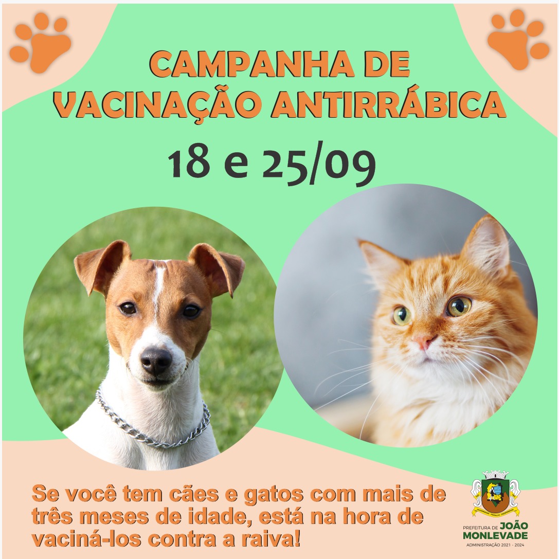 A Prefeitura de João Monlevade, por meio da Vigilância em Saúde (Visa), realiza nos dias 18 e 25 de setembro a Campanha de Vacinação Antirrábica. Serão vacinados cães e gatos com mais de três meses de idade contra a raiva. Confira as datas, locais e