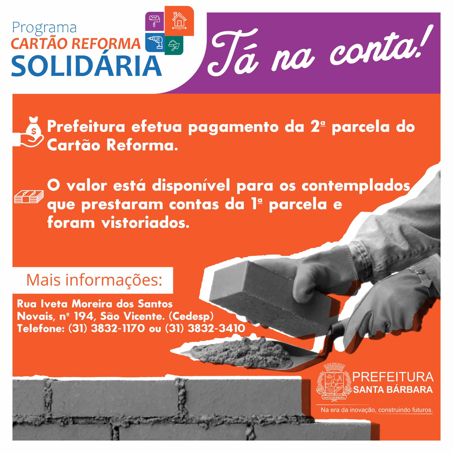 Nova parcela. A Prefeitura de Santa Bárbara iniciou na última sexta-feira (17), a liberação da 2ª parcela aos contemplados do programa Cartão Reforma Solidária
