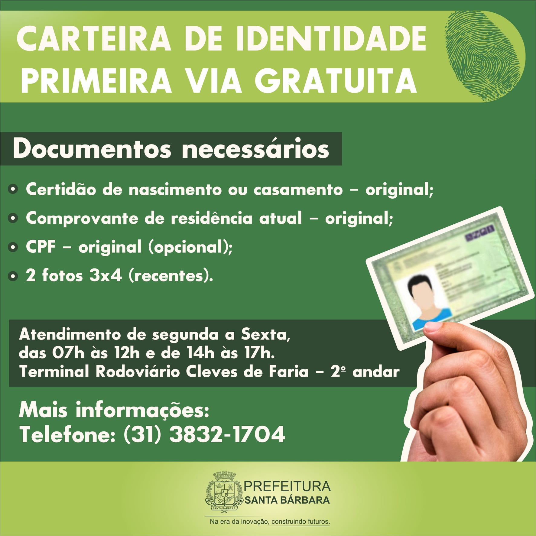 A Prefeitura de Santa Bárbara por meio da Secretaria de Governo e Ordem Pública realiza a emissão da carteira de identidade no município.