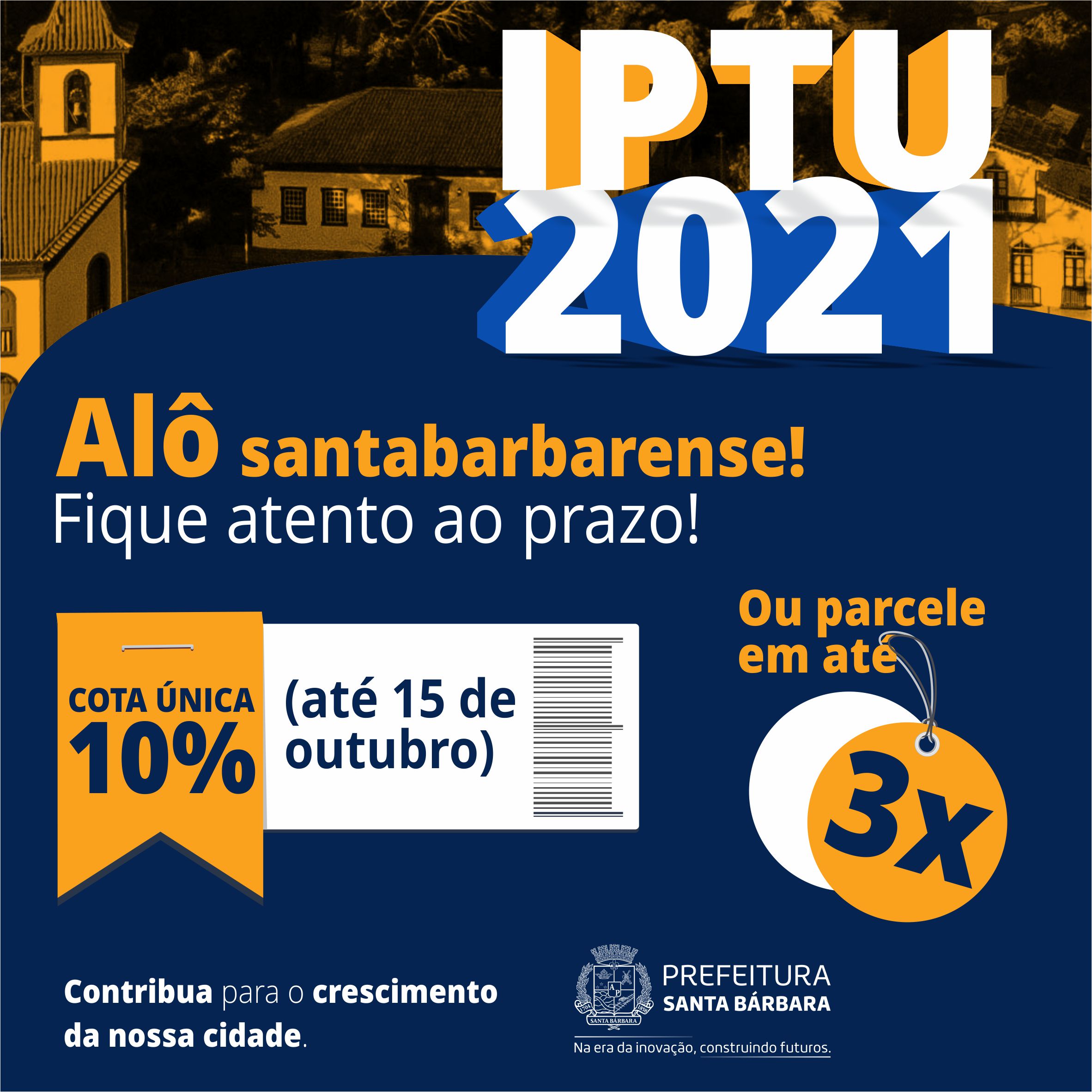 Fique ligado! O IPTU pode ser pago em parcela única, até 15 de outubro, com 10% de desconto. Já para o cidadão que optar pelo parcelamento, poderá quitar em até três vezes, as parcelas vencem no dia 15 dos meses de outubro, novembro e dezembro. Os pagamentos poderão ser realizados na Caixa Econômica Federal, Bradesco, Itaú ou Correios.