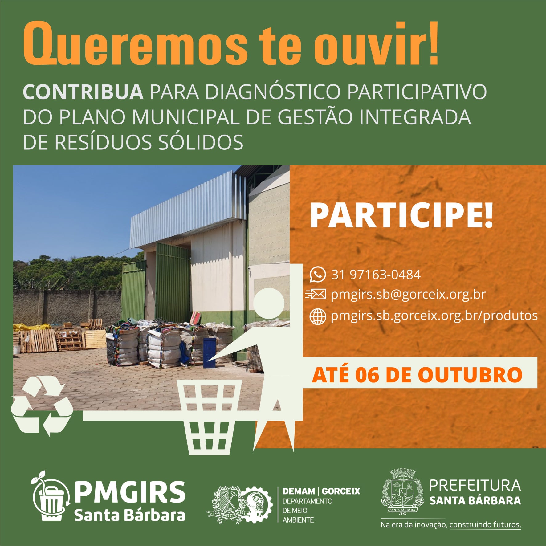 Construção. A Prefeitura de Santa Bárbara por meio da Secretaria de Meio Ambiente e Agropecuária, realiza Consulta Pública para a elaboração do Plano Municipal de Gestão Integrada de Resíduos Sólidos (PMGIRS).