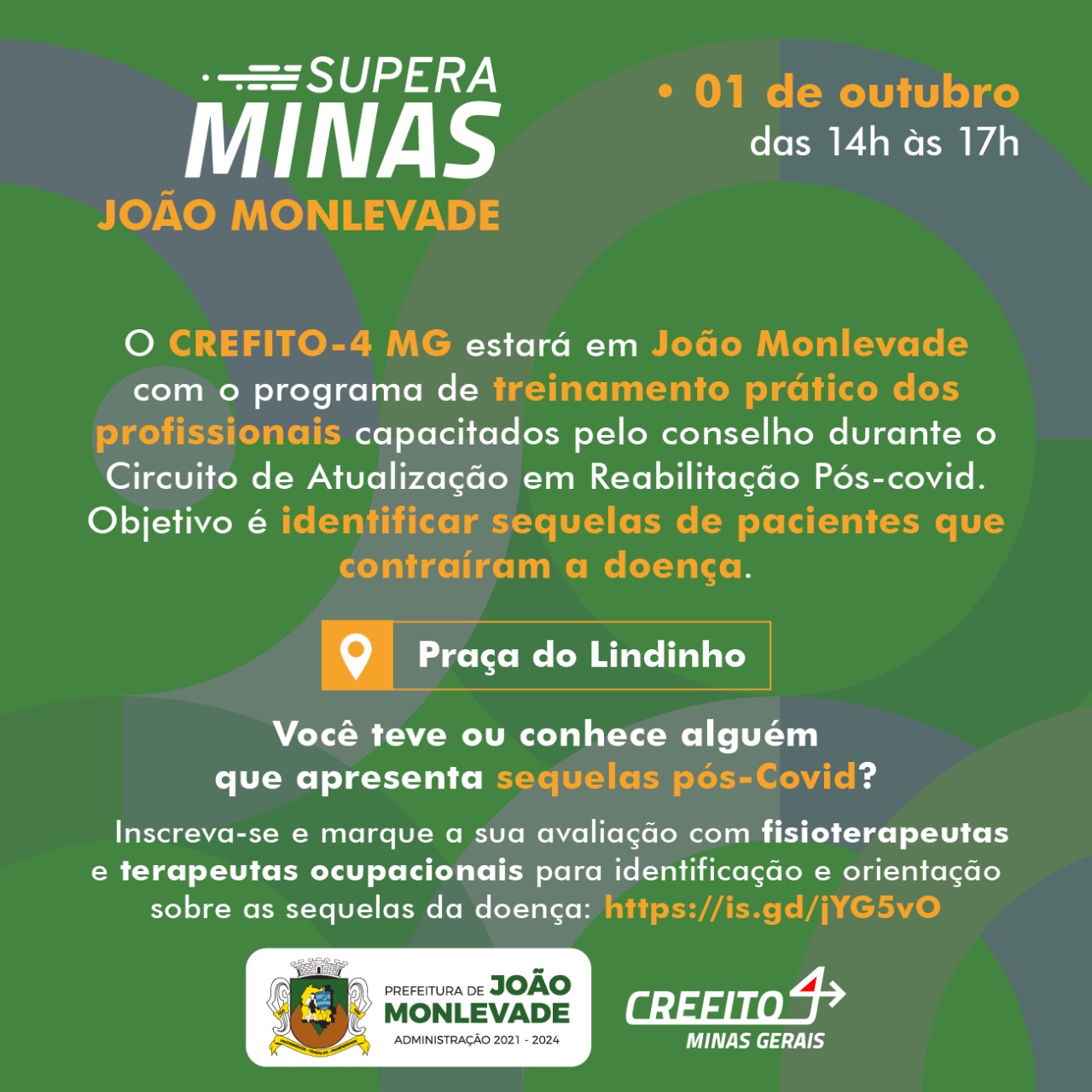 O Conselho Regional de Fisioterapia e Terapia Ocupacional da 4ª Região (Crefito-4) realiza em João Monlevade na sexta-feira (1) o programa “Supera Minas”, que consiste em um treinamento prático dos fisioterapeutas e terapeutas ocupacionais capacitados pelo conselho durante o Circuito de Atualização em Reabilitação Pós-covid.