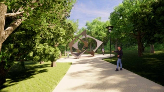 Projeção gráfica de vista terrestre do interior do parque municipal. Área para exposição de arte.