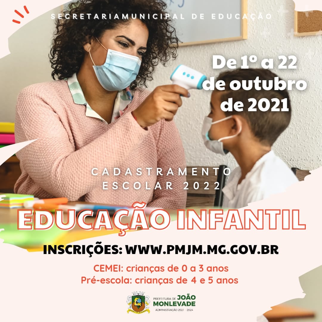 A Prefeitura de João Monlevade, por meio da Secretaria Municipal de Educação, abre inscrições do cadastramento escolar para o ano letivo de 2022. O período será a partir desta sexta-feira (1º) até o dia 22 de outubro, exclusivamente pela internet, no site da Prefeitura de João Monlevade (http://portais.pmjm.mg.gov.br/inscricao-infantil/)