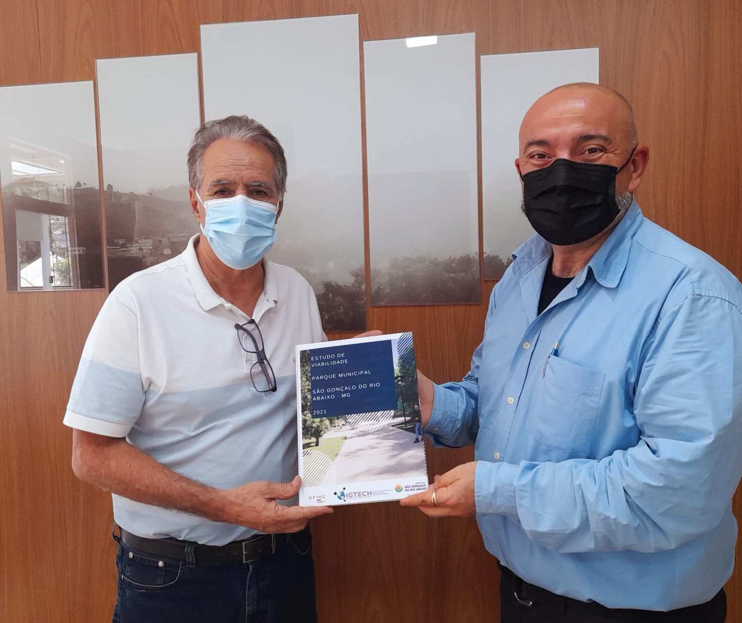 A Universidade Federal de Minas Gerais (UFMG) entregou na tarde de hoje (7) ao prefeito de São Gonçalo do Rio Abaixo, Raimundo Nonato de Barcelos (Nozinho) o estudo de viabilidade do Parque Municipal Urbano. O estudo feito pelo Instituto de Gestão Territorial e Geotecnologias (Igtech) da universidade abrange o planejamento da paisagem e todo o contexto arquitetônico do projeto. Na foto, o prefeito Nozinho recebe estudo das mãos do arquiteto do Instituto, professor Alfio Conti.