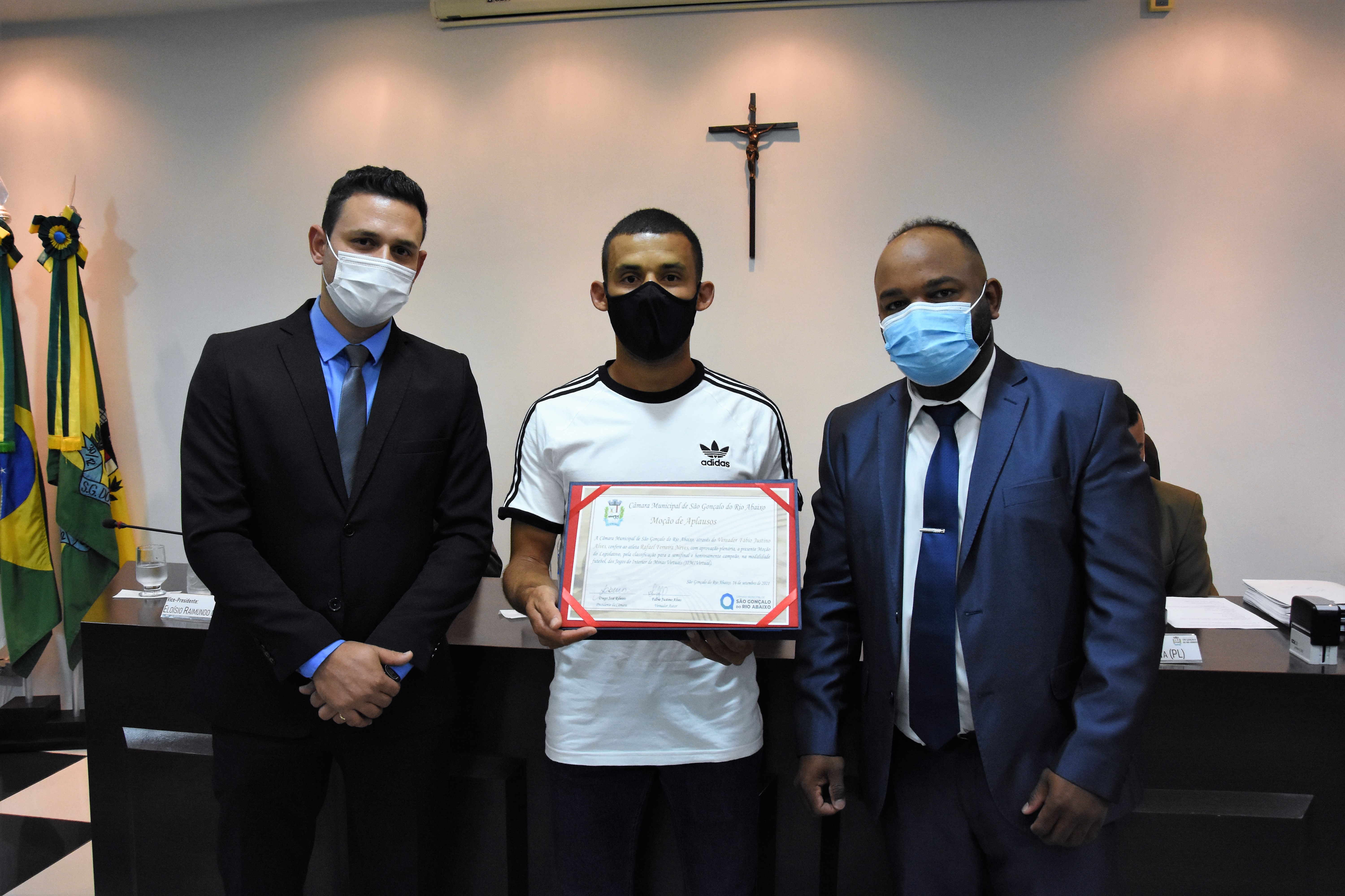 O atleta Rafael, mais conhecido como “Tcheco”, foi à tribuna agradecer aos vereadores, em especial ao Sassá (PSB) e ao Marlon Túlio Pessoa Costa (PL), pelo seu apoio e amizade de longa data. Agradeceu também ao seu amigo Neymar, que sempre esteve ao seu lado, e ao Secretário Municipal de Esportes, Wallysson de Freitas Vieira, e a todas as pessoas que lhe ajudaram. Além disso, expressou a sua felicidade pela conquista para a cidade, frisando que “não é apenas uma vitória individual, mas também de todos os são-gonçalenses”.