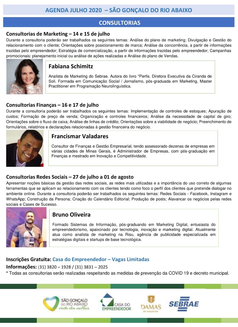 A Casa do Empreendedor de São Gonçalo do Rio Abaixo retoma este mês as consultorias nas áreas de marketing, finanças e redes sociais promovidas em parceria com o Sebrae. As consultorias serão individuais, respeitando as medidas de prevenção da Covid-19 e poderão ser realizadas na empresa ou na Casa do Empreendedor.