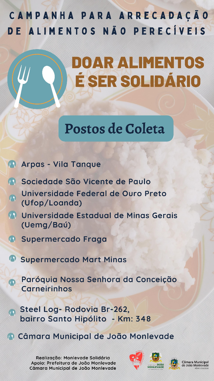 As doações podem ser deixadas na sede do Legislativo ou nos postos de coleta: Arpas no bairro Vila Tanque, Sociedade São Vicente de Paulo, UFOP, UEMG, Supermercado Fraga, Mart Minas, Paróquia Nossa Senhora da Conceição e Steel Log no bairro Santo Hipólito.